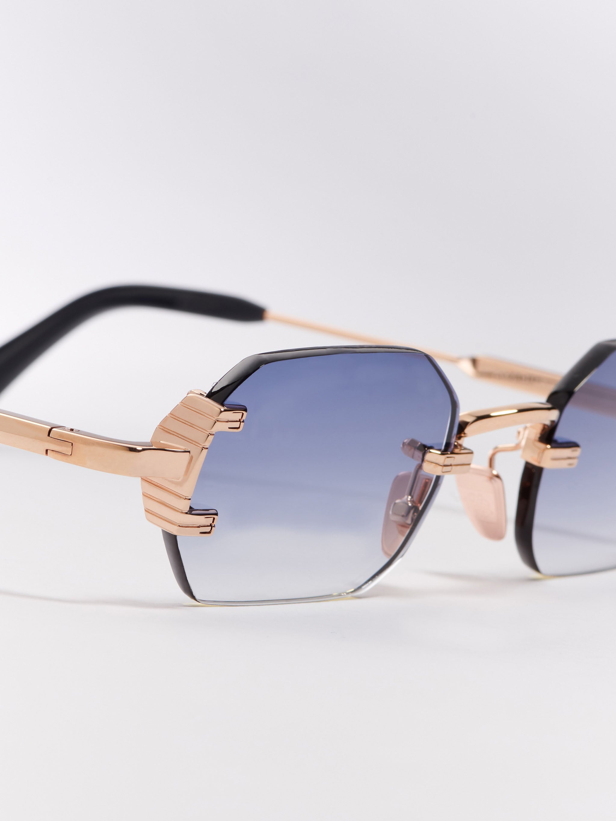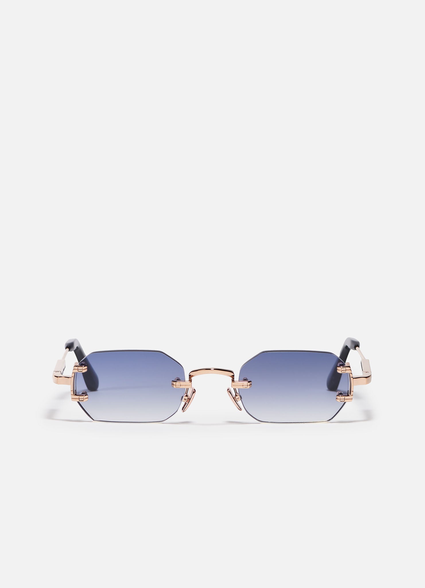 The metal corewire is made of stainless steel with a rose gold plating (5µ and jeweler's stamp on the inner side of the temples). Temple tips in navy blue acetate. Nose pads rose gold colored.
