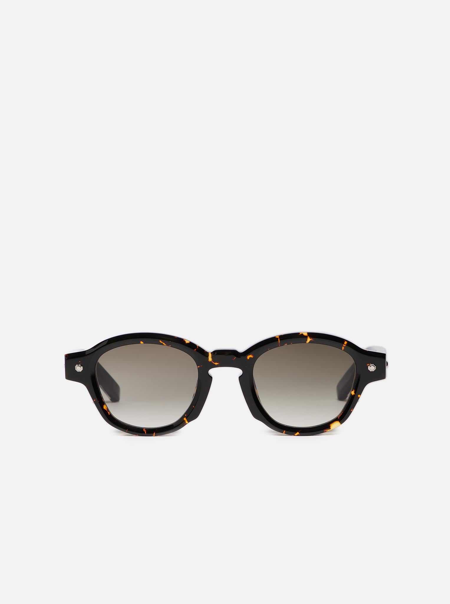 Project 10 est une monture unisexe fabriquée à partir d'une feuille d'acétate de 8 mm. Elle présente une forme pantos, une armature et des charnières signature John Dalia, ainsi que des picots décoratifs.