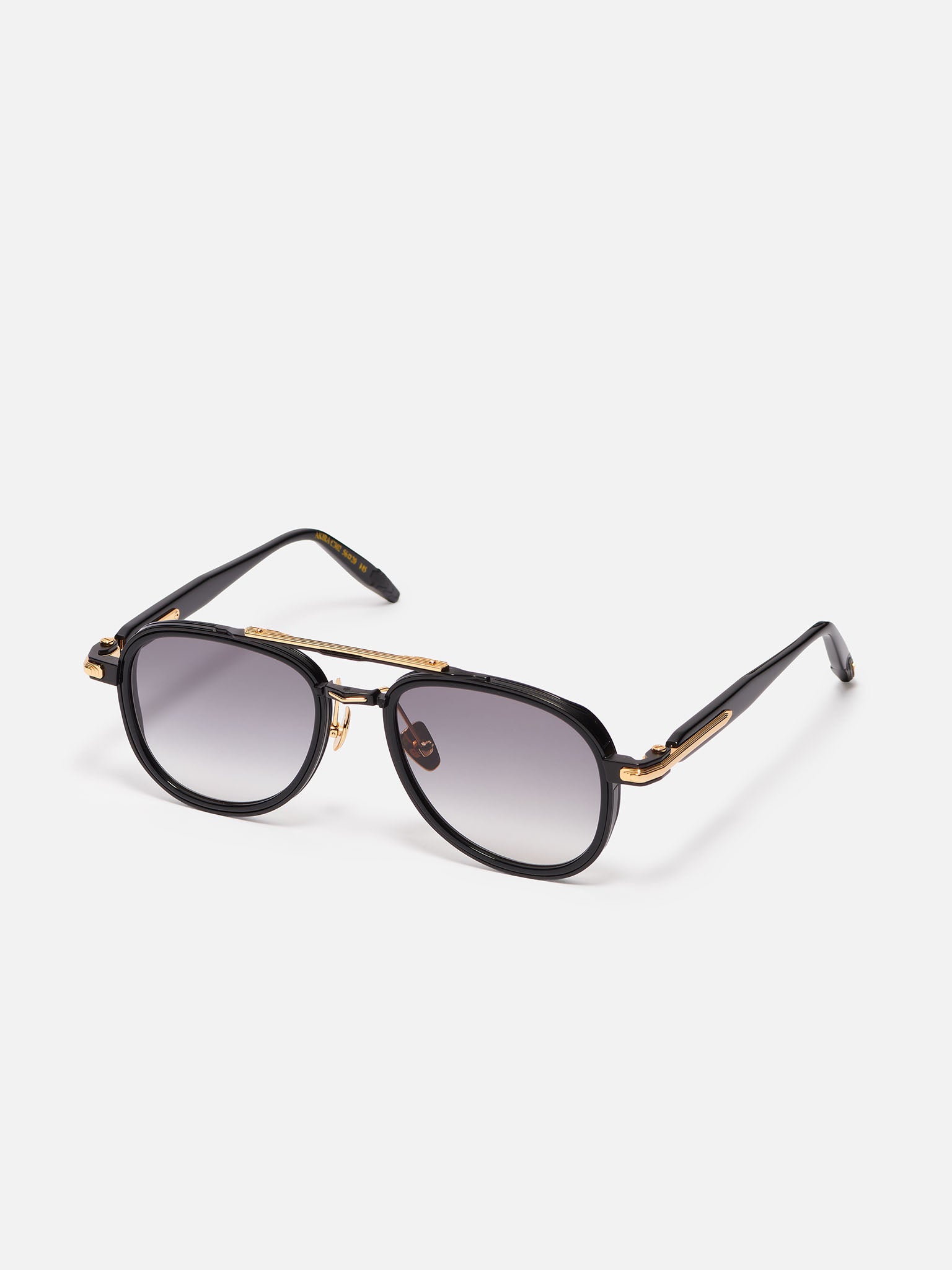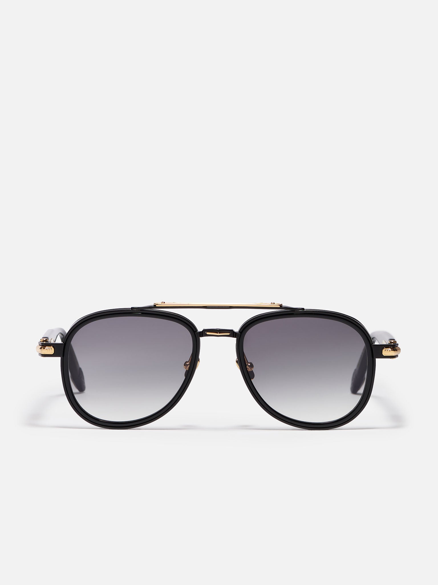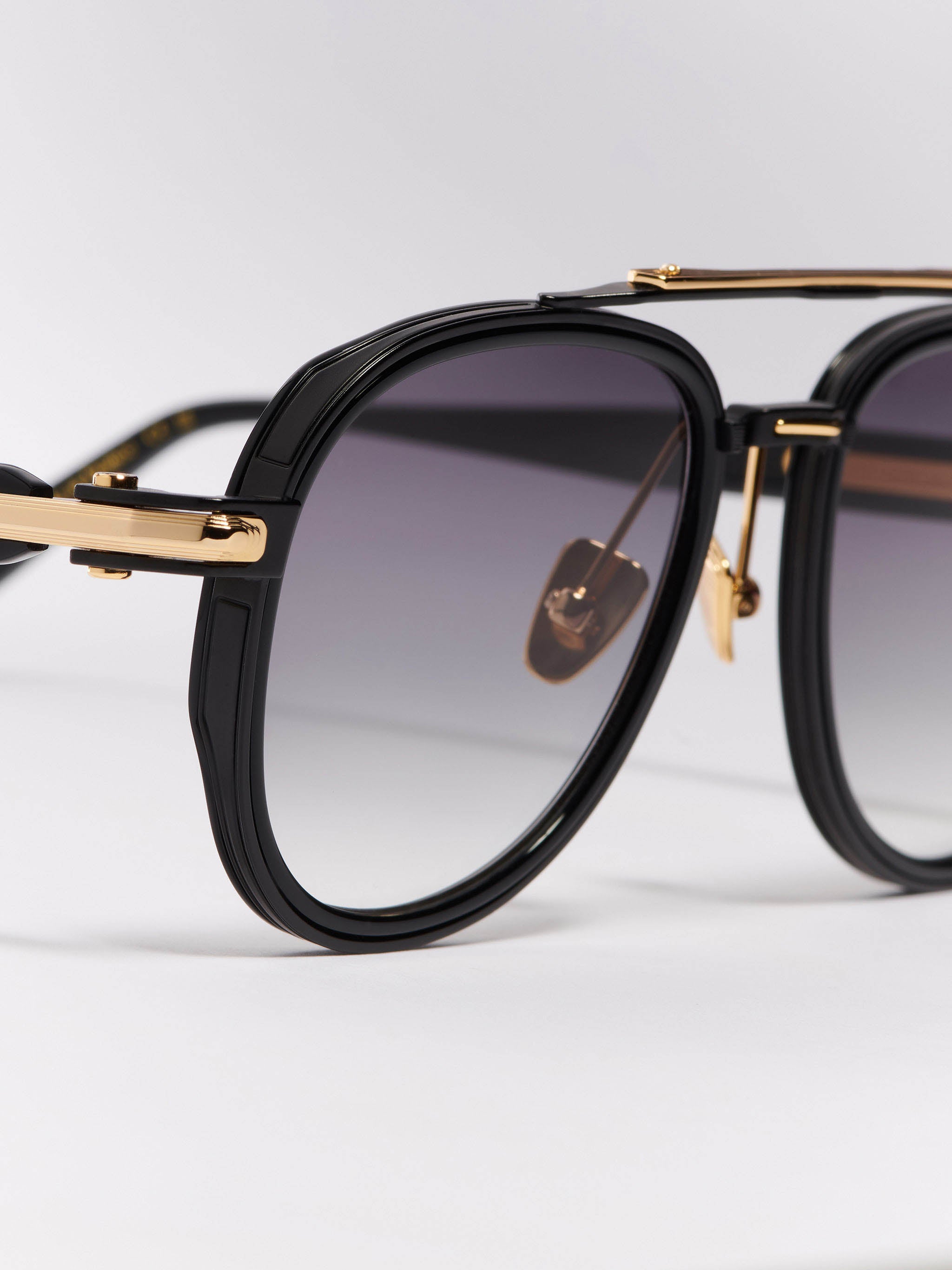 Unisex aviator shaped frame combining a titanium corewere, metal details and acetate elements in a refined fusion of materials.