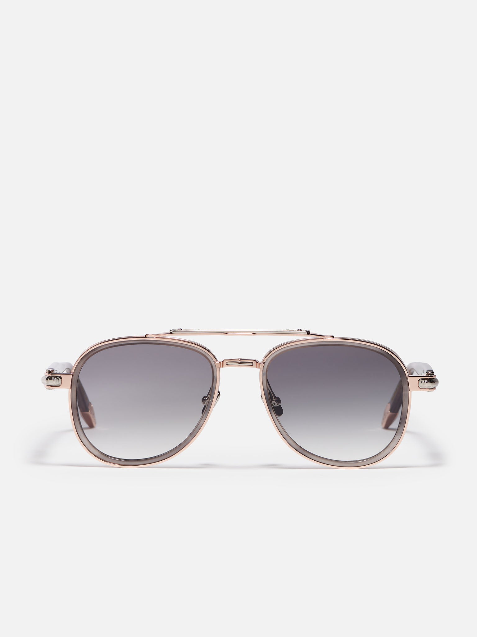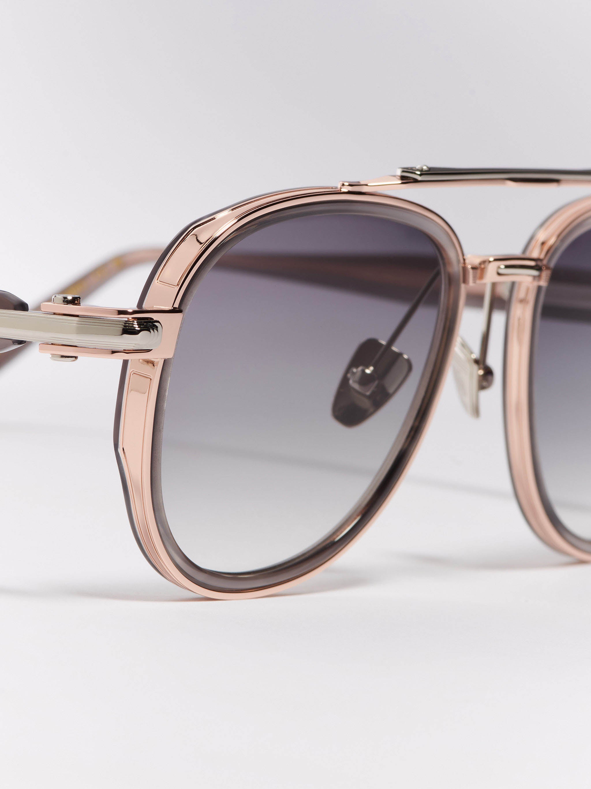 Rose gold titanium corewire structure with platinium plated decorative elements (3µ). The temple tips and rims are crafted from Workman grey.