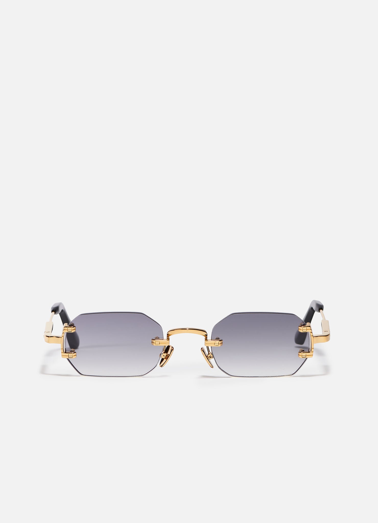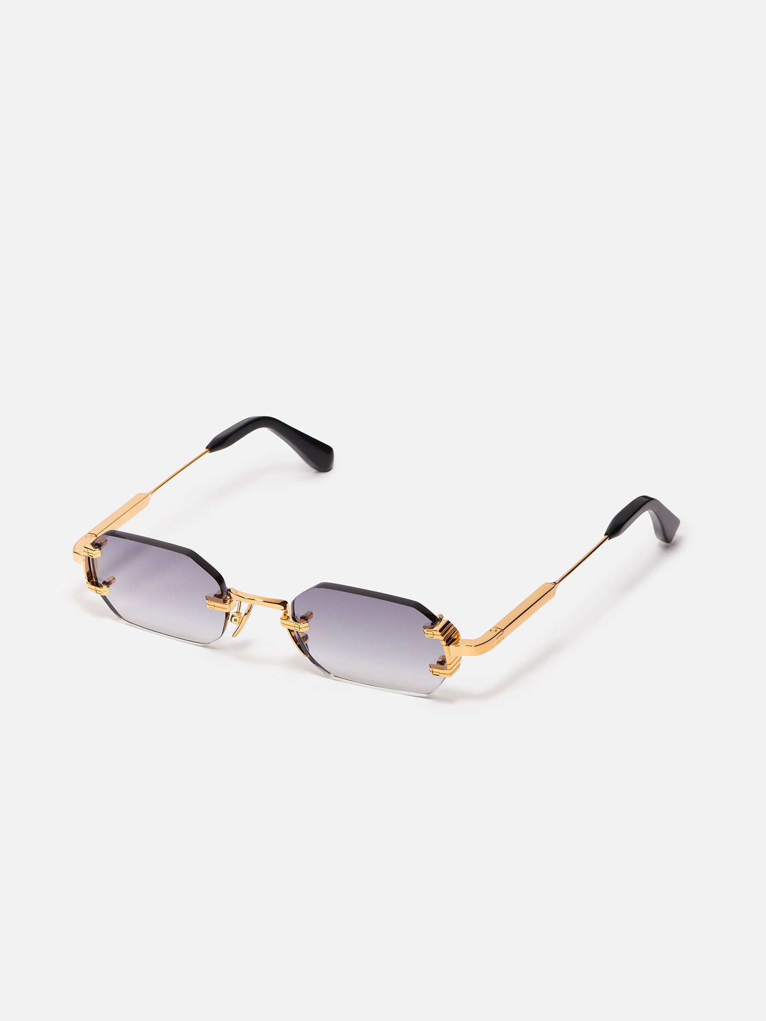 Unisex rimless frame in a rectangular shape with a double drilling point on the outer edges of the lenses. The frame features titanium nose pads and thick acetate temple tips.