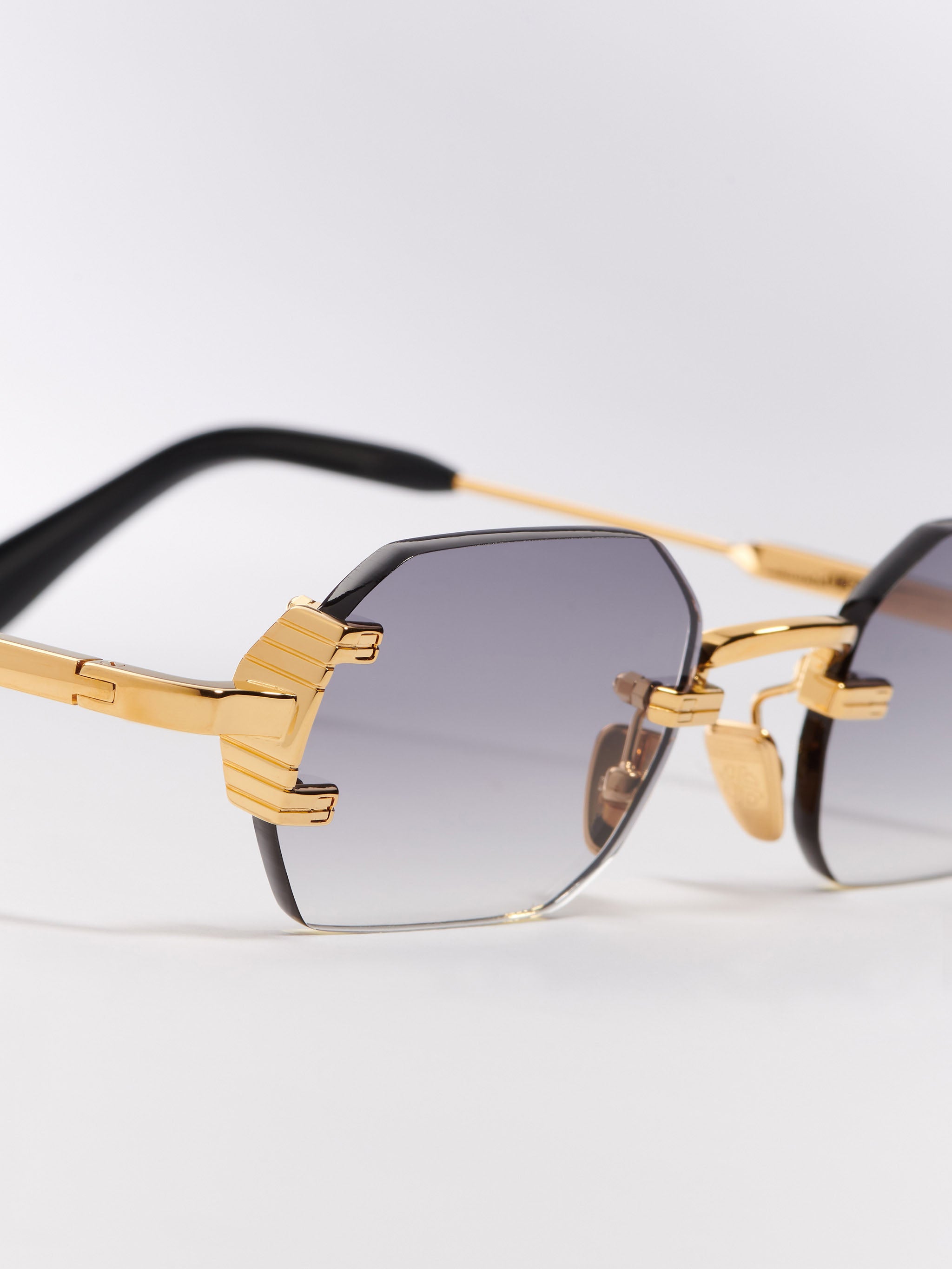 The metal corewire is made of stainless steel with a yellow gold plating (5µ and jeweler's stamp on the inner side of the temples). Temple tips in shiny black acetate. Nose pads yellow gold colored.