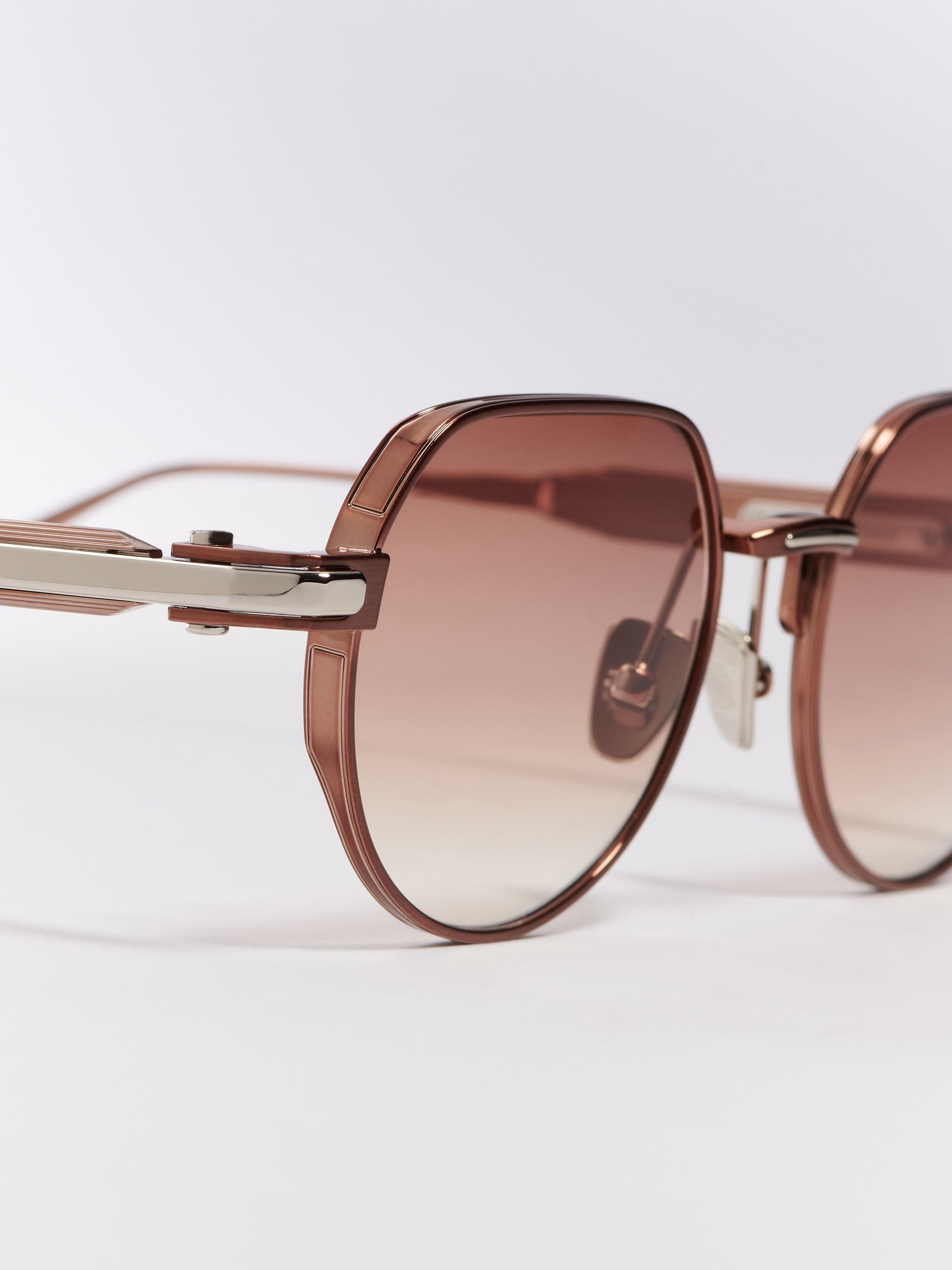 The temples extend seamlessly into sculpted metal end tips, conceived as a natural continuation of the architecture. With subtle variations in thickness and finely striated finishes, the temples highlight the distinctive character of the design.