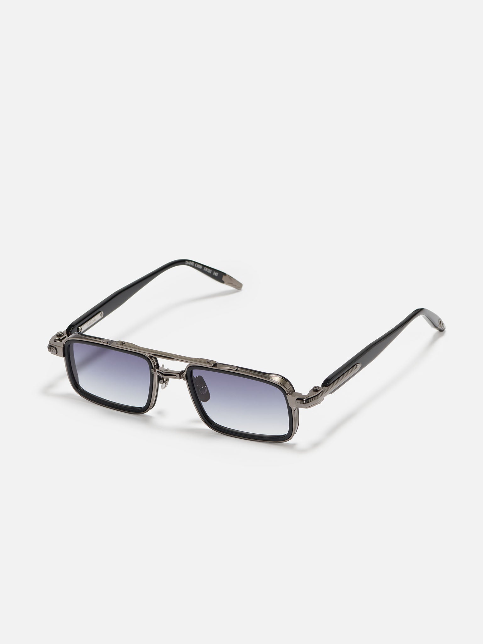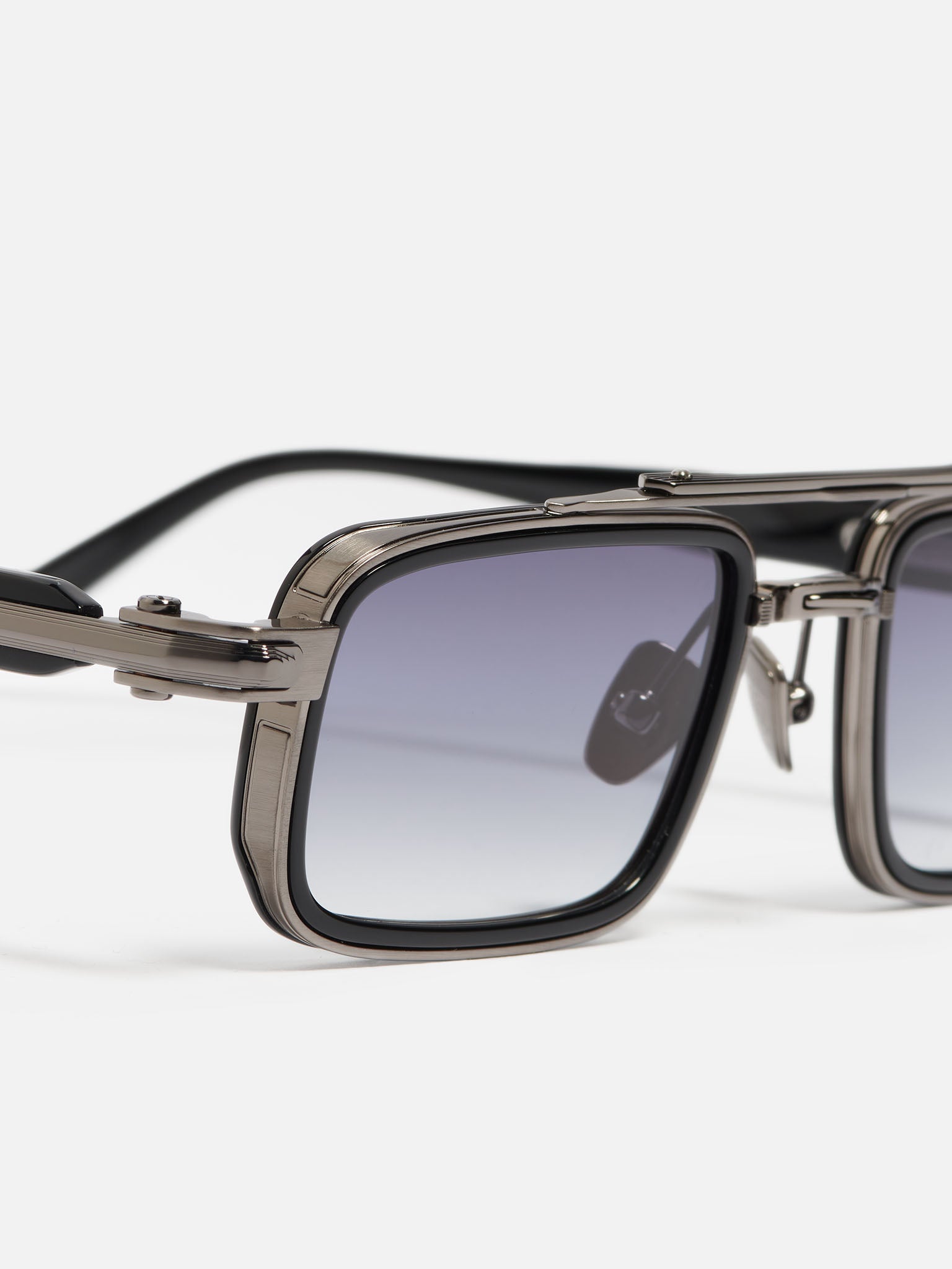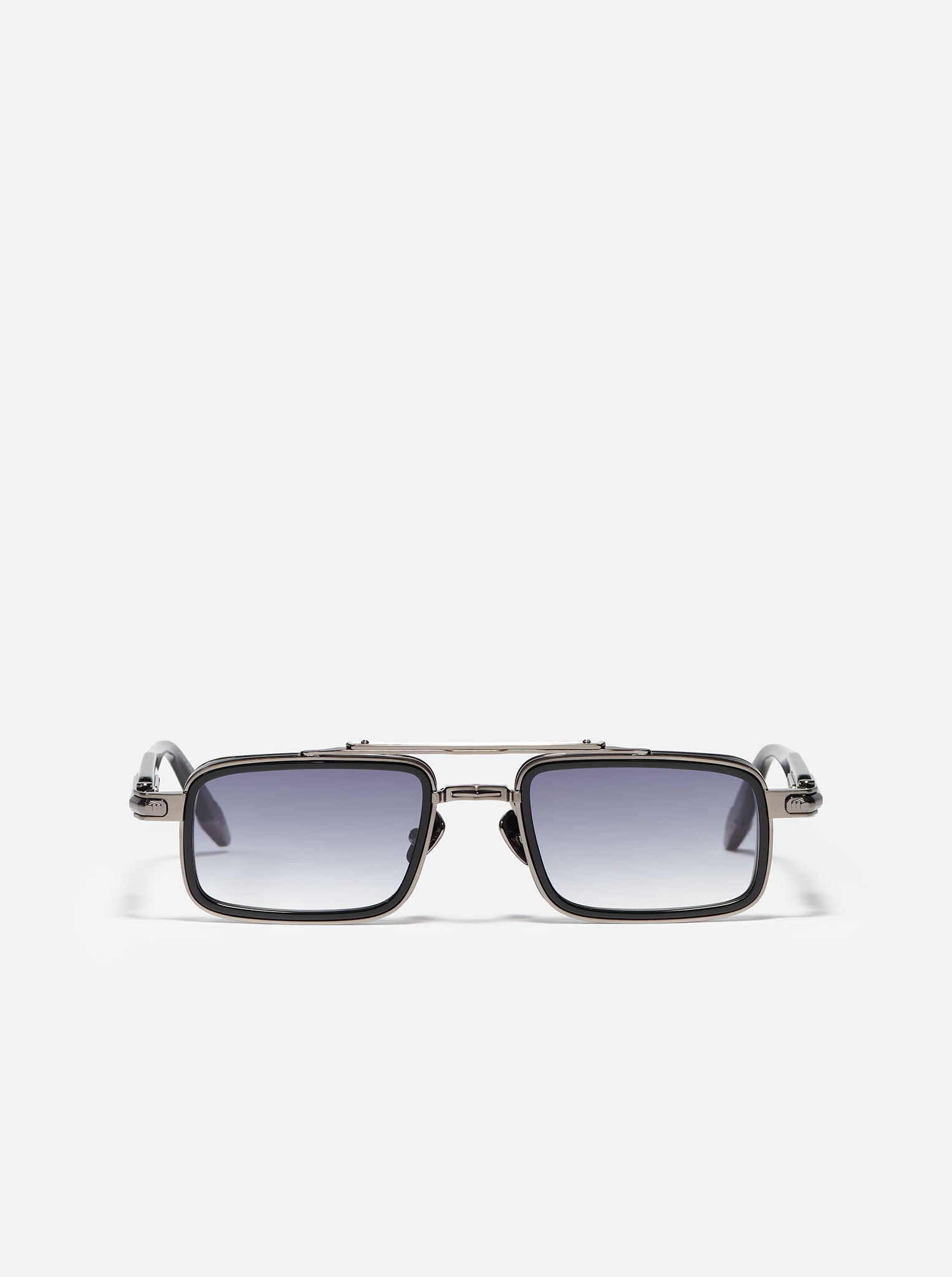 Unisex rectangular shaped frame combining a titanium metal and acetate structure with metal details in a refined fusion of materials. The frame features a double bridge, where the titanium nose pads are attached via a metallic extension.