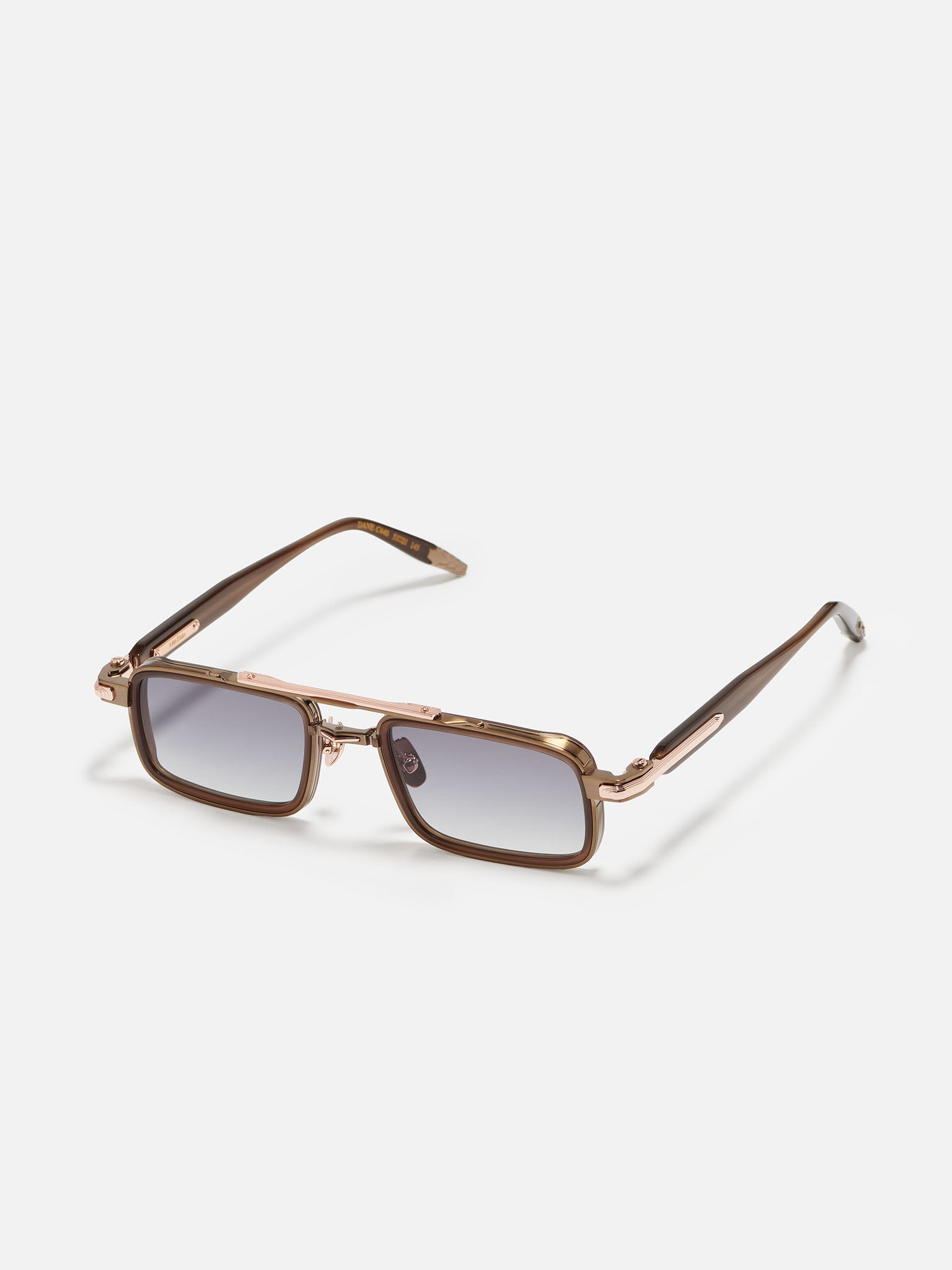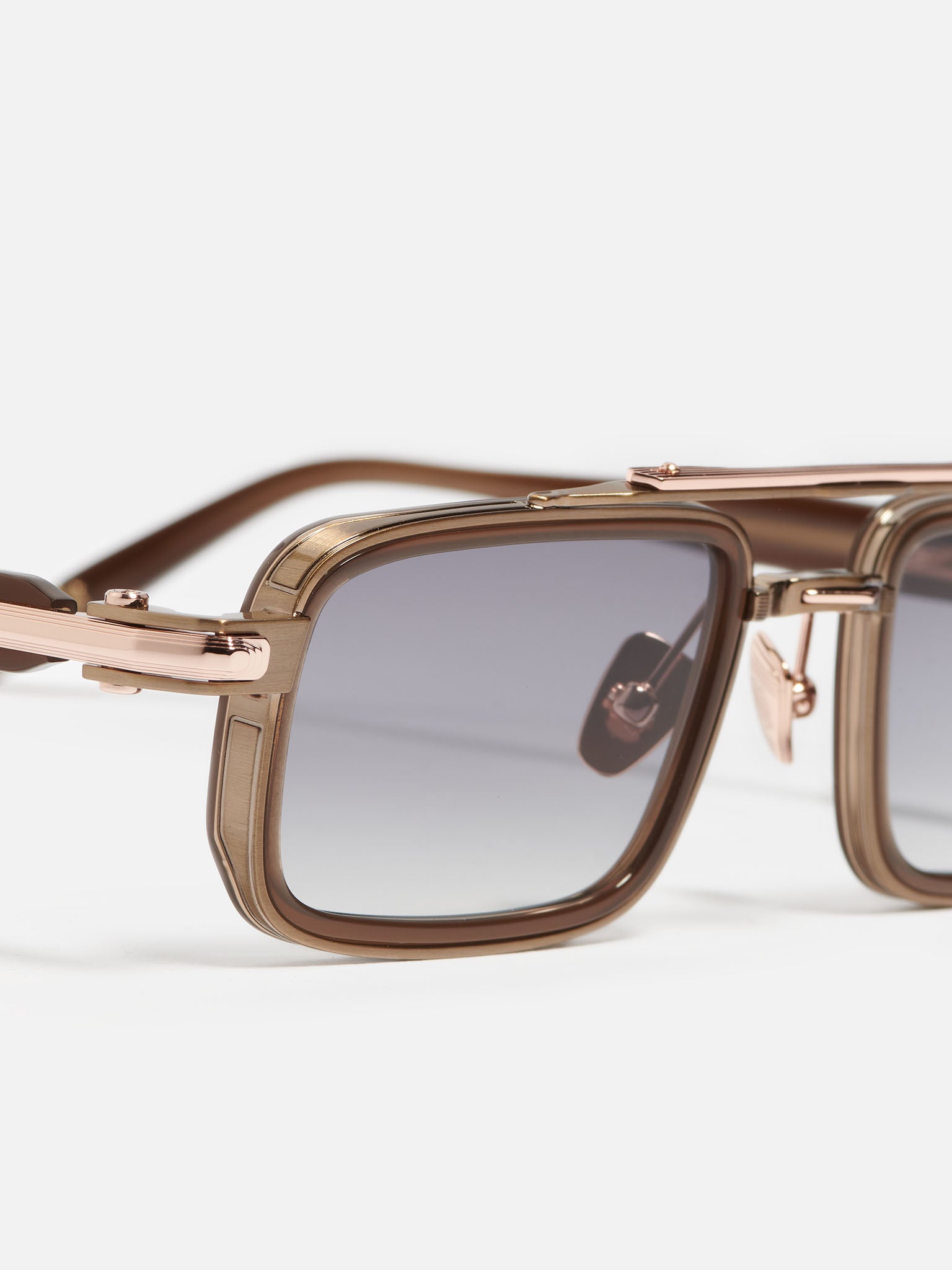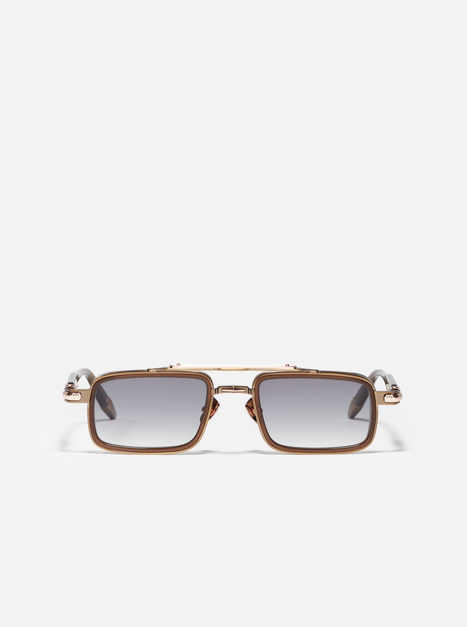 Cristal brown titanium corewire structure with a rose gold plating (5µ, with a jeweler’s stamp inside the temple). Temple tips and eye rims in cristal brown acetate.