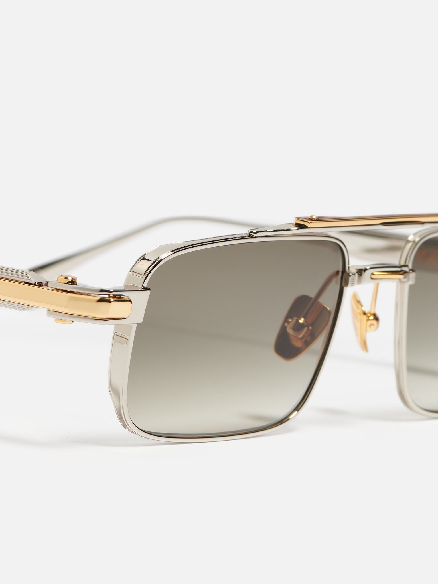 The temples extend seamlessly into sculpted metal end tips, conceived as a natural continuation of the architecture. With subtle variations in thickness and finely striated finishes, the temples highlight the distinctive character of the design.