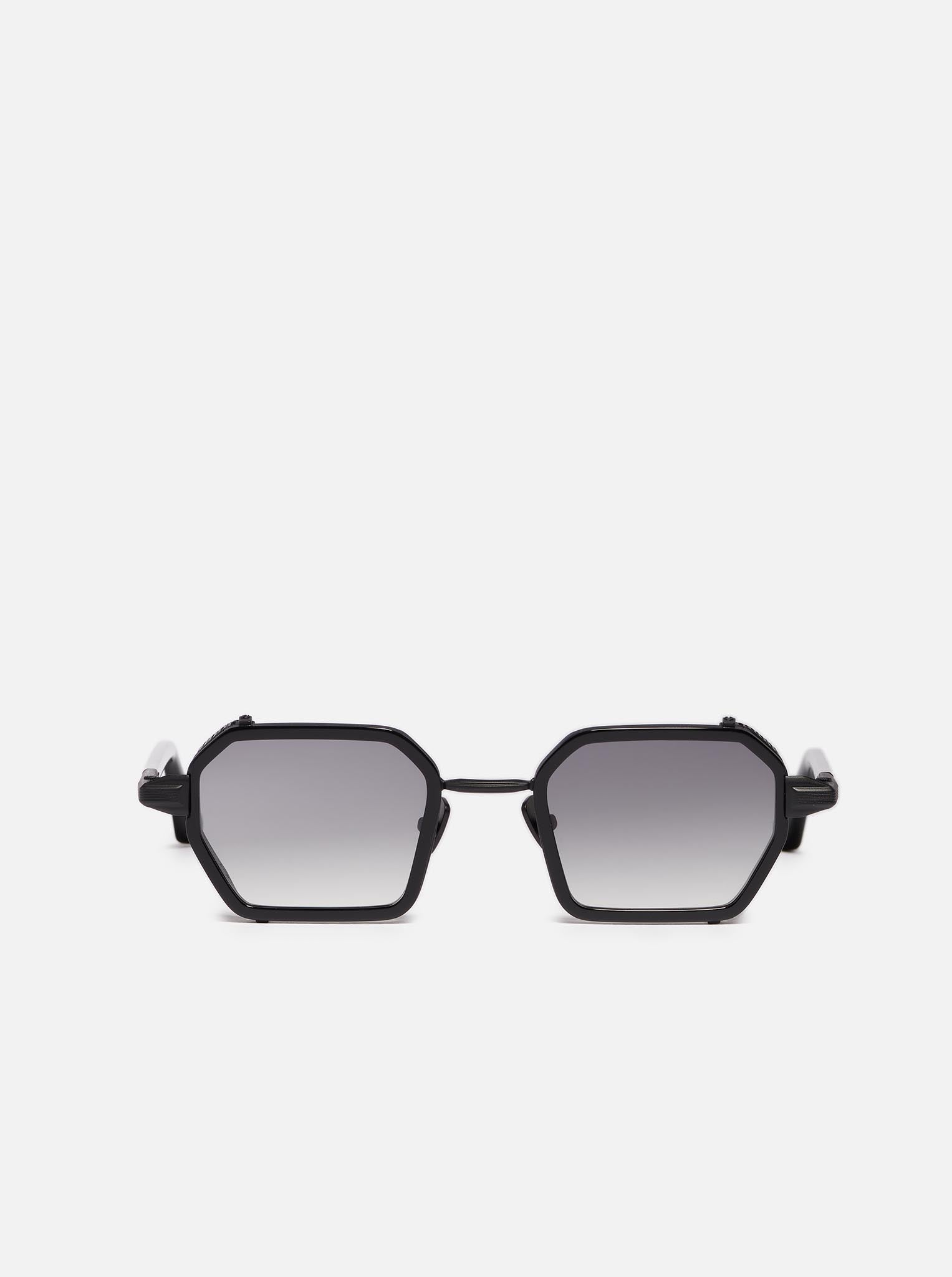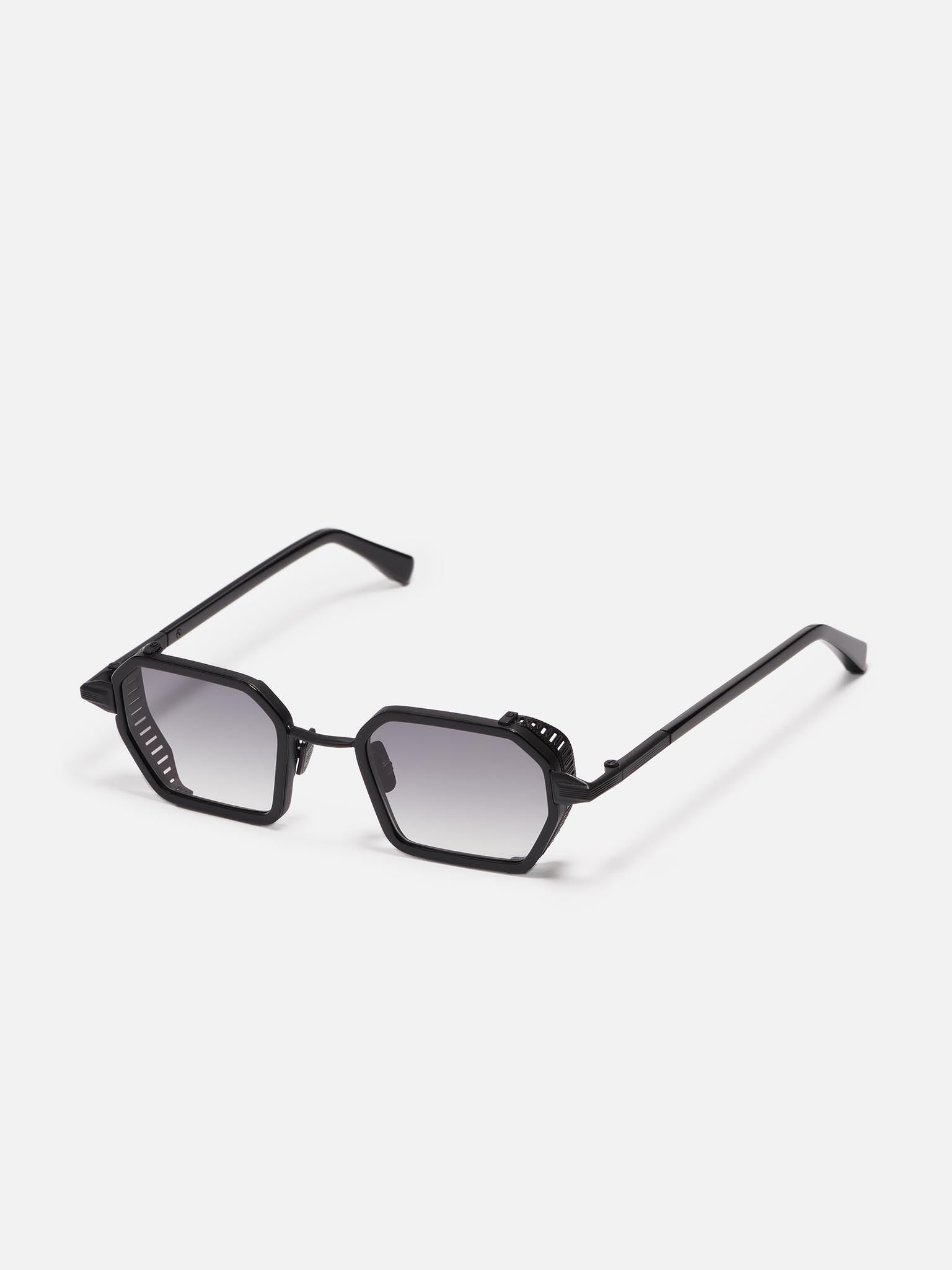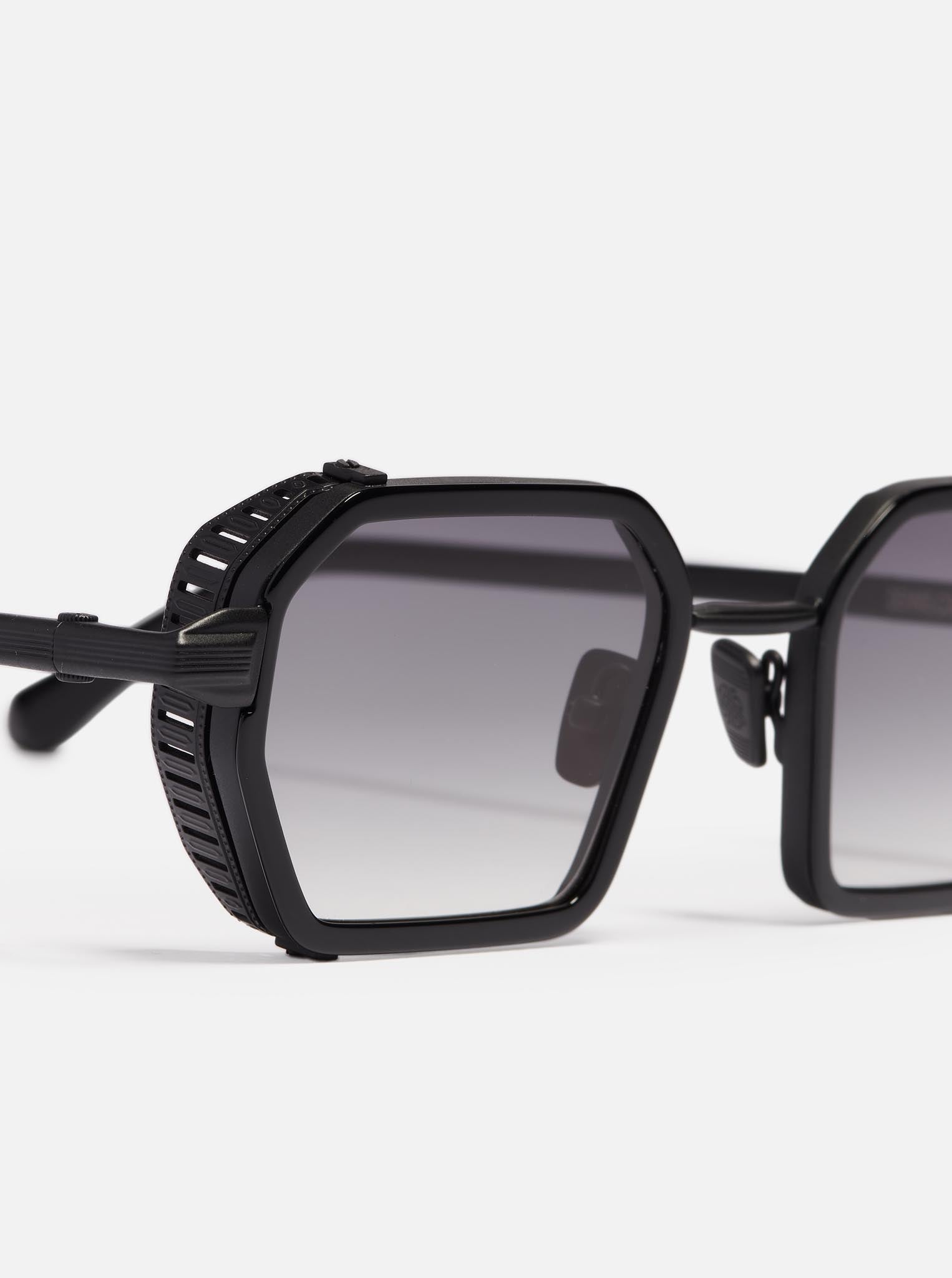 Geometric men’s frame with wide, grooved end pieces. Features protective titanium glacier side shields. Titanium nose pads and extended acetate temple tips for optimal comfort.