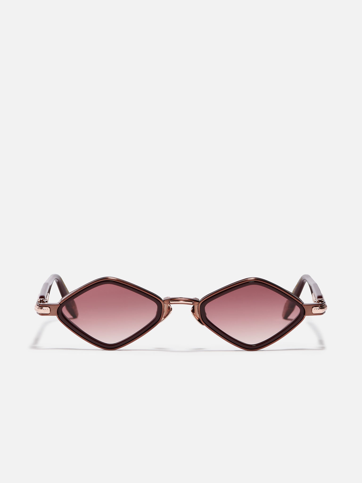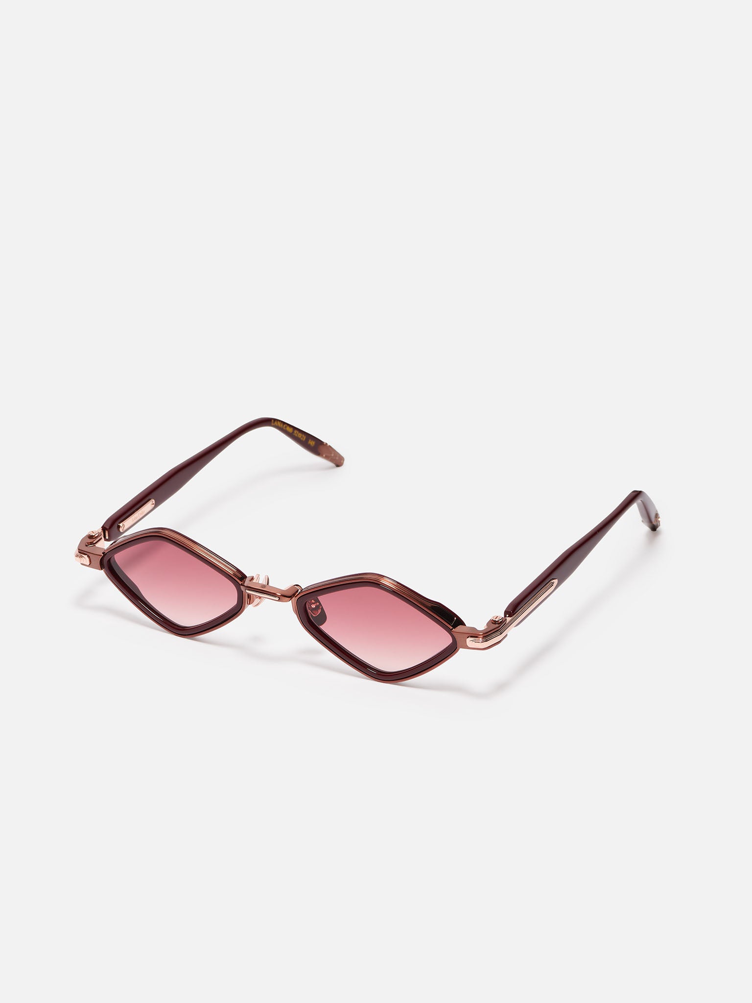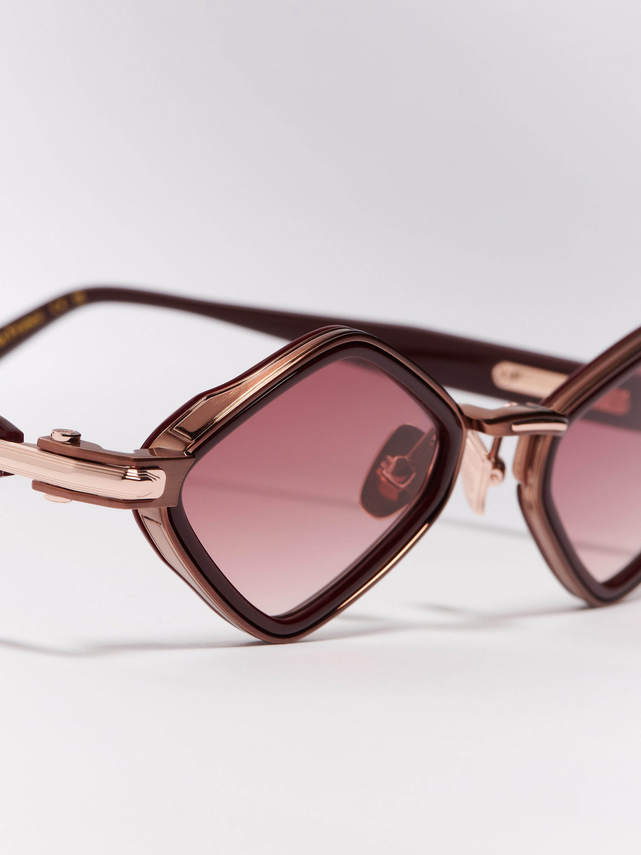 Brushed copper titanium corewire structure with rose gold plated decorative elements (5µ, with a jeweler’s hallmark inside the temple). The temple tips and rims are crafted from Burgundy.