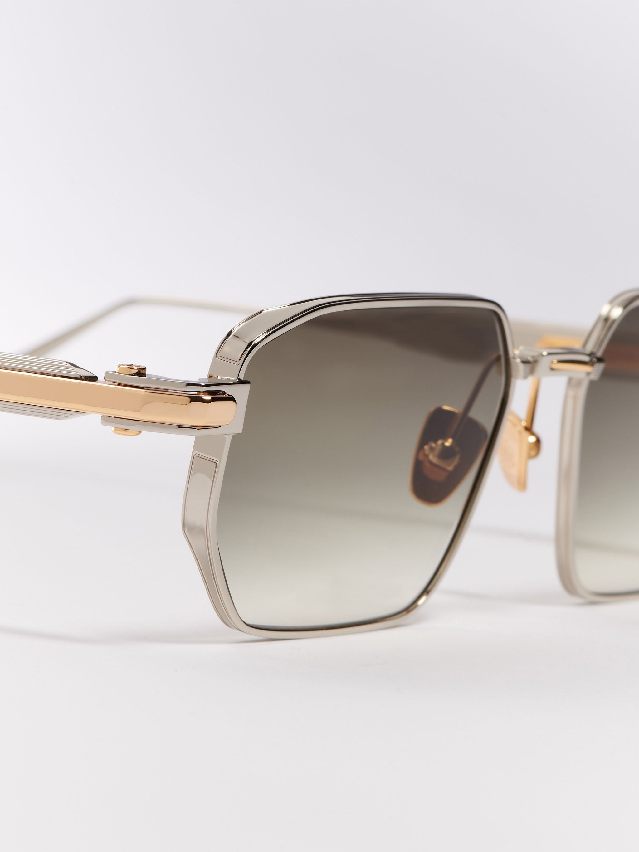 The temples extend seamlessly into sculpted metal end tips, conceived as a natural continuation of the architecture. With subtle variations in thickness and finely striated finishes, the temples highlight the distinctive character of the design.
