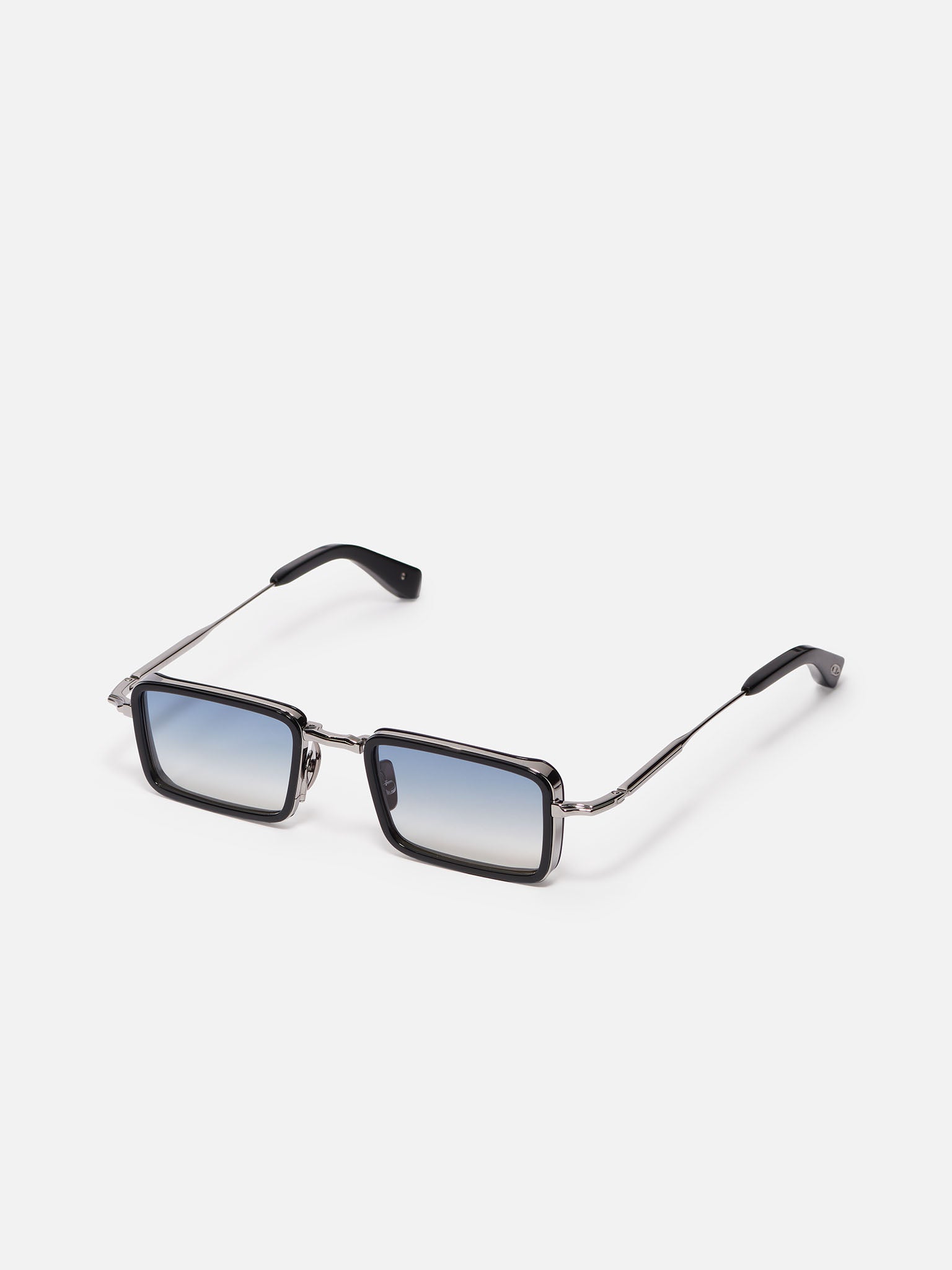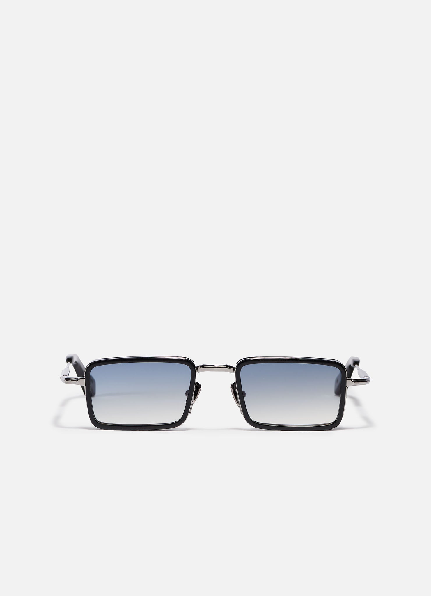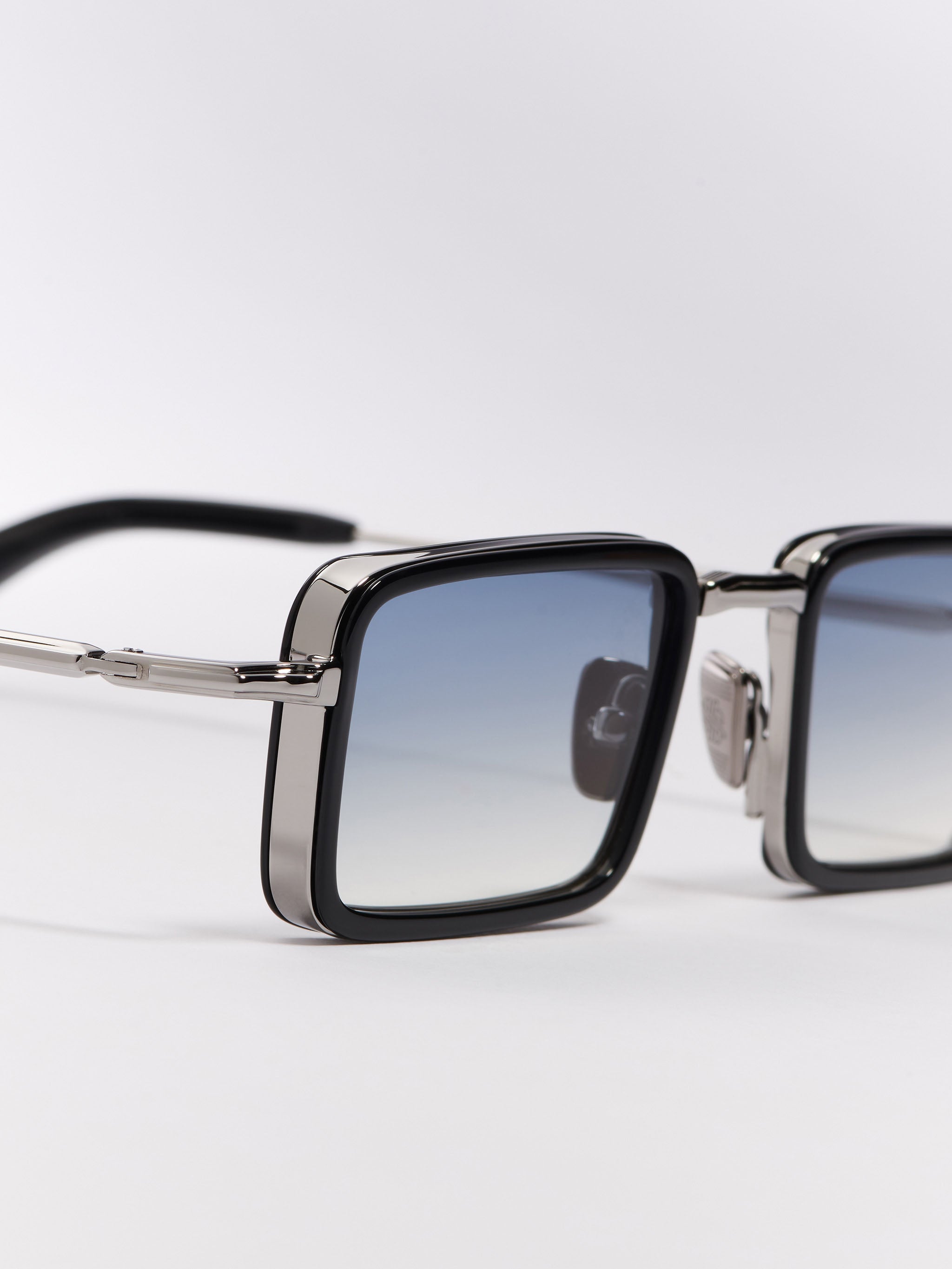Unisex rectangular shaped frame combining a titanium corewere, metal details and acetate elements in a refined fusion of materials.