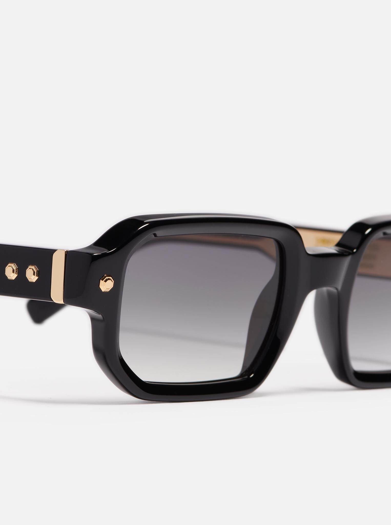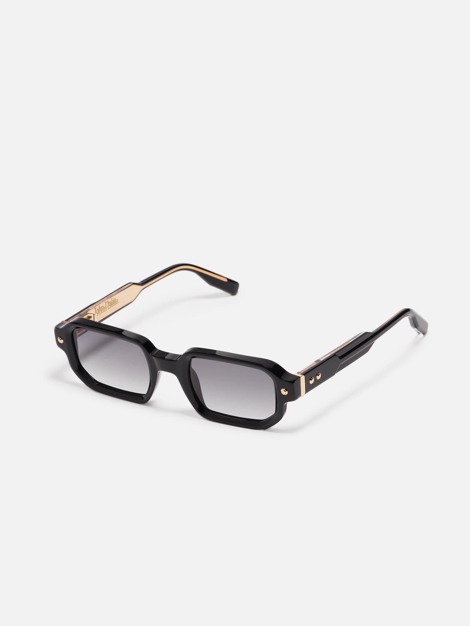 Shiny black acetate. Corewire, decorative elements in yellow gold colored stainless steel. Grey gradient CR39 lenses with an anti-reflective coating on the inner surface.