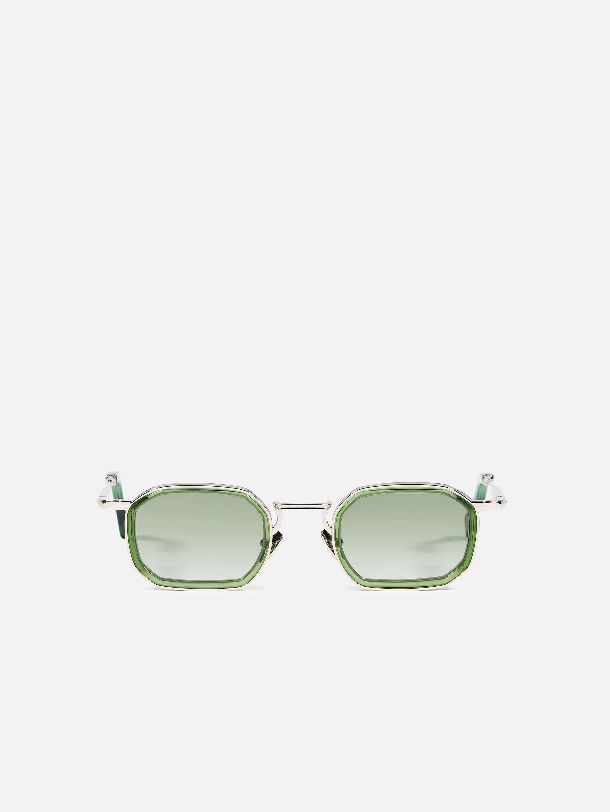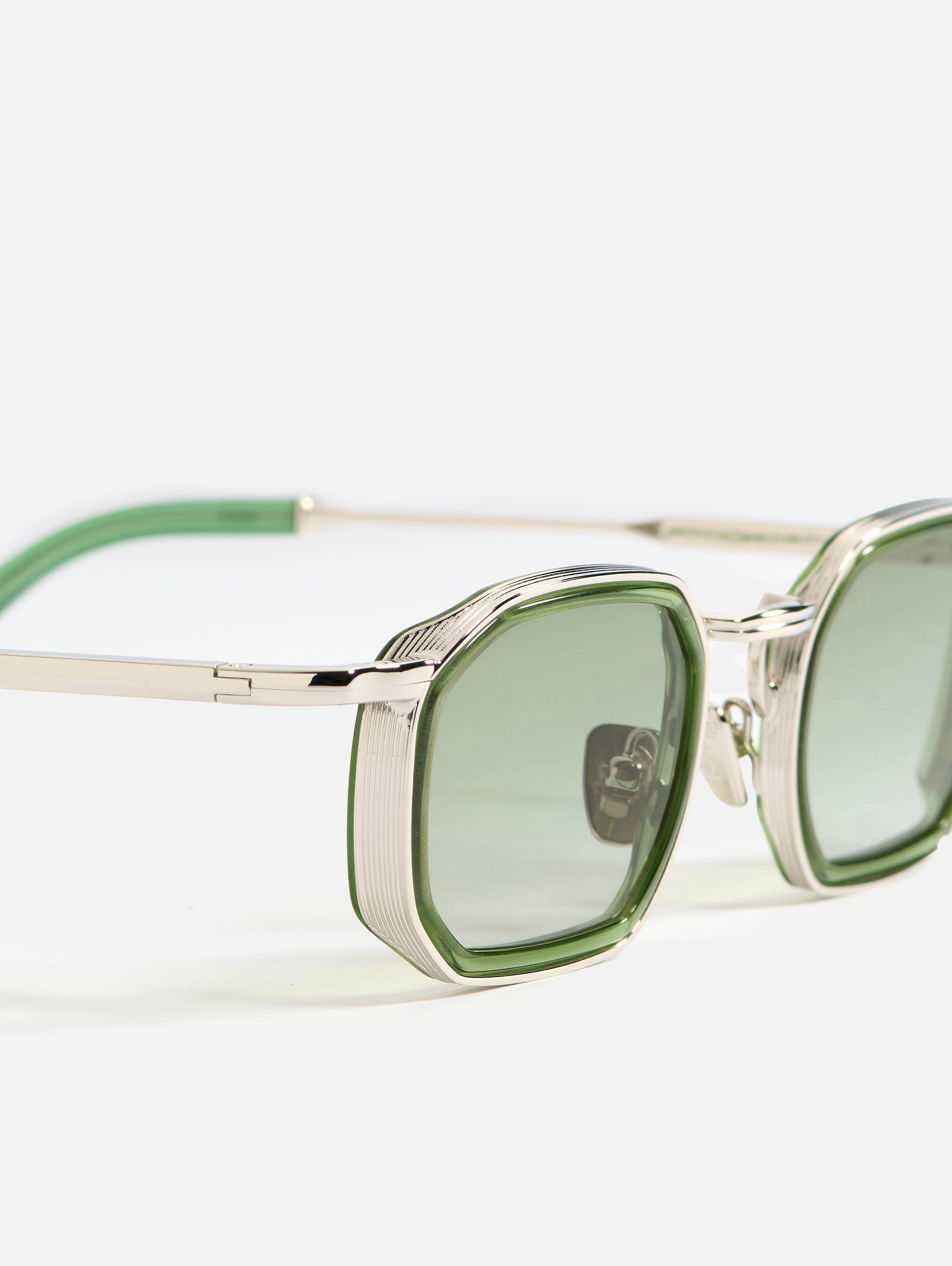 A square shape with rims carved out of a 4mm engraved metal strip. The frame is enlivened by our new geometric bridge and features traditional end pieces. Transparent green acetate & Palladium plated alloy frame. Light green gradient CR39 lenses with AR treatment. Reference C-164. Case and cleaning cloth are included.