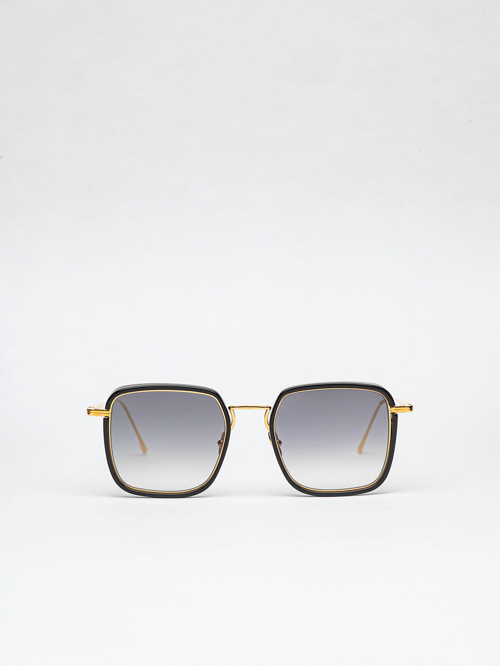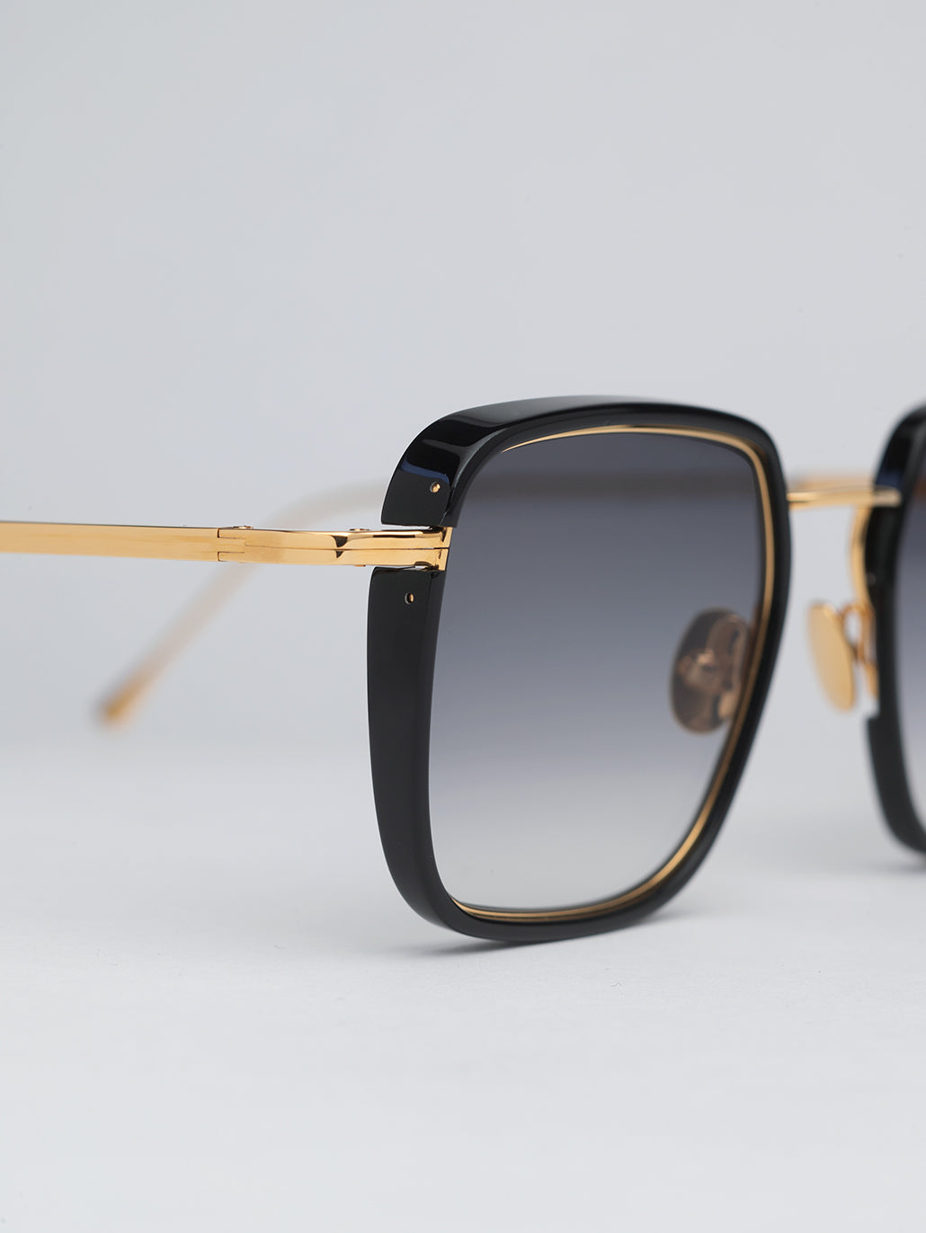 An oversized square frame for women enlivened by our new geometric bridge and featuring traditional end pieces. Custom infinite black acetate & 22-carat yellow gold plated alloy frame (c. 5µ layer and jewelry stamp inside the temple). Grey gradient CR39 lenses with AR treatment. Reference C-100. Case and cleaning cloth are included.